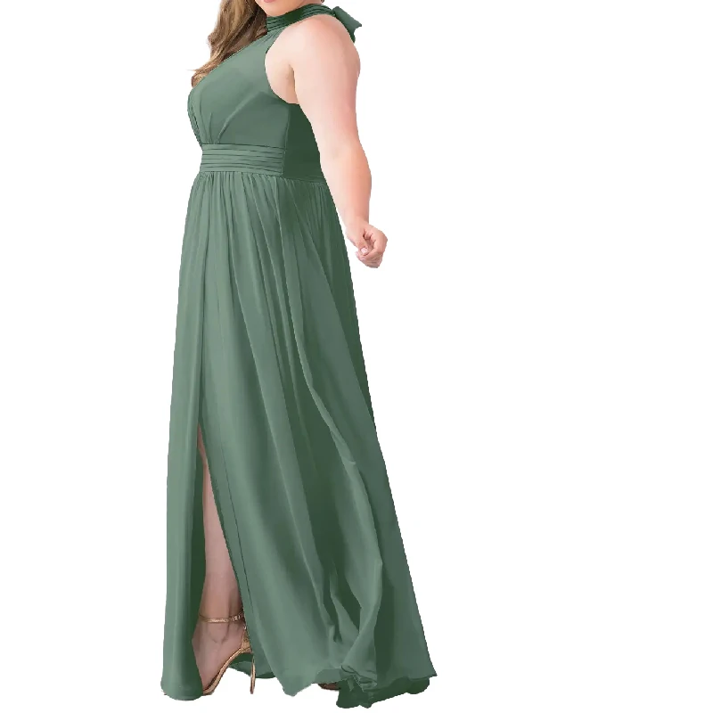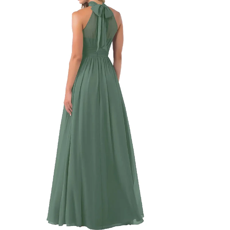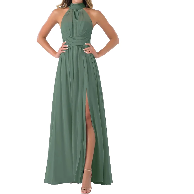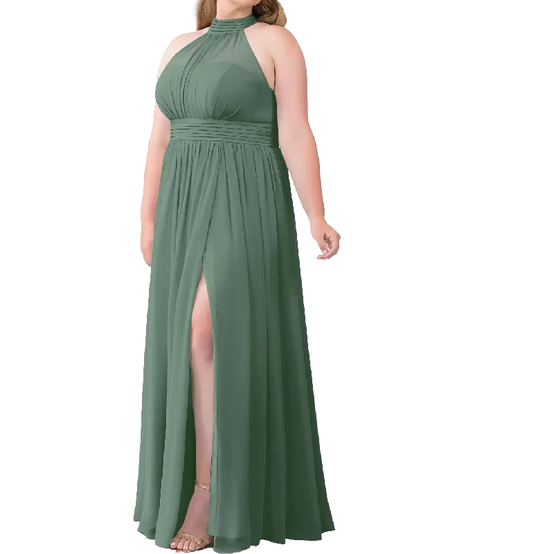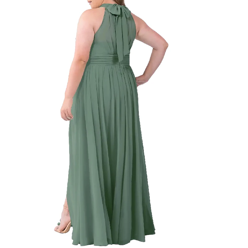 Elegant Plus Size Halter Neck Tie Back Pleated Chiffon Floor Length Bridesmaid Dresses with Side Slit